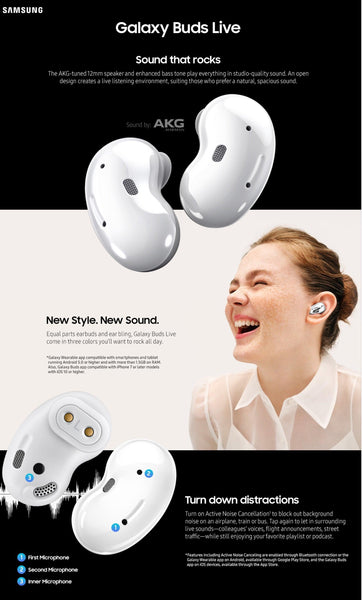 Introducing Galaxy Buds LiveEarbuds designed to tune in to every moment. With an iconic shape and ergonomic design, the adaptive fit lets in desired sounds from your natural surroundings, and a dynamic speaker system optimised for a better experience. This is sound made just for your ears.