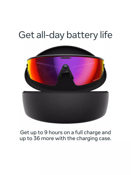 A fully charged pair of Oakley Meta Vanguard glasses can last up to 6 hours of continuous audio playback and 9 hours of typical use. You can fully charge Oakley Meta Vanguard in 75 minutes. The charging case can provide an additional 36 hours of charging on the go.