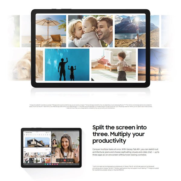 Elevate your daily entertainment to new heights with the new Galaxy Tab A9+. Watch more videos from the couch or on the go and enjoy browsing on the 11” wide display. Immerse yourself in gaming and entertainment with the high performance processor that creates. You can even be flexible with your layouts using Multi Window and view up to three applications at once. If you have other Galaxy devices, you can expect seamless connectivity of audio, photos, videos and more stay entertained.