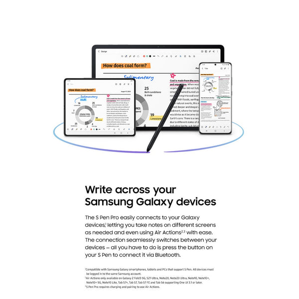 The S Pen Pro easily connects to your Samsung Galaxy devices, letting you take notes on different screens as needed and even using Air Actions† with ease. The connection seamlessly switches between your devices all you have to do is press the button on your S Pen Pro to connect it via Bluetooth.